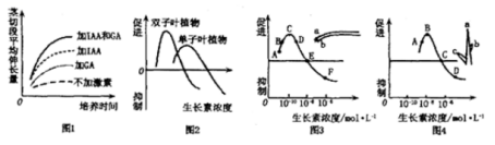 解 析:A、图1中,与单独加生长素(IAA)或赤霉素(GA)组相比,IAA和GA同时存在时对茎切段细胞伸长有促进作用,A错误; B、据图2分析,双子叶植物较单子叶植物对生长素更敏感,B正确; C、重力会使生长素在向地侧集中分布,故背地侧生长素浓度较低,促进生长,向地侧生长素浓度较高,抑制生长,图3中幼根a侧生长素浓度若在曲线C点,则b侧生长素浓度可以在E和F之间,或者大于F,C错误; D、顶芽产生的生长素会向下运输,积累在侧芽,抑制侧芽生长,故图4中侧芽b生长素的浓度可以为D或者大于D,顶芽a所含生长素的浓度可以为A或B,D错误。 故选:B。