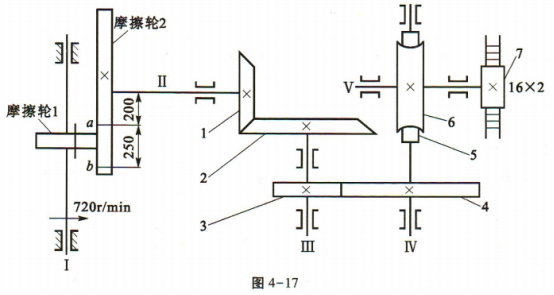 1、如图4-17所示传动装置,动力从I轴输入,输入转速为720r/min;摩擦轮1的直径为300mm,并可沿Ⅰ轴上下移动,a、b点为其移动范围;轮1、2组成标准直齿锥齿轮传动,轮3、4组成标准斜齿圆柱齿轮传动,传动比均为2;轮5、6组成单头蜗杆传动,传动比为30;轮7为标准正常直齿圆柱齿轮;所有齿轮的模数均为2mm,要求轴Ⅲ、Ⅳ上的轴向力尽可能小,试回答下列问题: