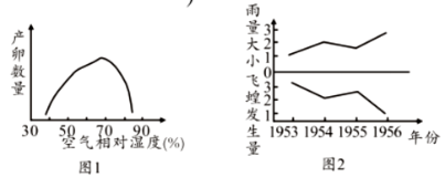 2、科学家在调查蝗区的自然环境特点,飞蝗种群的数量动态变化情况时发现东亚飞蝗的产卵量与空气的相对湿度的关系,如图1所示;东亚飞蝗的发生量与降雨量的关系,如图2所示。下列相关叙述错误的是()