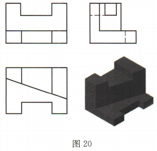 解 析:结合主、俯视图可知,该组合体由几块不规则的基本体切割而成,如图20所示。