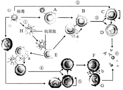 1、早在人类出现之前,病毒就占领了这个星球,历经高温、酷寒等极端条件,到现在病毒仍然无处不在。在一个健康人体内,病毒的含量也有约3×1012个,但通常情况下,我们并未感到不适,这归功于我们体内的免疫系统。如图表示人体对抗病毒的部分免疫过程,图中数字表示生理过程,小写字母表示相关物质,大写字母表示相关细胞。请回答: