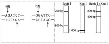 解 析:A、A选项中的DNA用KpnⅠ单独酶切会得到600bp和200bp两种长度的DNA分子,与题意不符,A错误;B、B选项中的DNA用KpnⅠ单独酶切会得到600bp和400bp两种长度的DNA分子,与题意不符,B错误;C、C选项中的DNA用KpnⅠ酶切后得到的DNA分子是1000bp,用EcoRⅠ单独酶切得到200bp和800bp两种长度的DNA分子,用EcoRⅠ、KpnⅠ同时酶切后得到200bp和400bp两种长度的DNA分子,与题意相符,C正确;D、D选项中的DNA用KpnⅠ酶切后得到400bp和600bp两种长度的DNA分子,与题意不符,D错误。