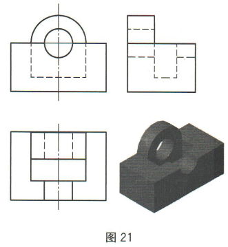 解 析:结合主、俯视图可知,该组合体由几块基本体切割而成,如图21所示。