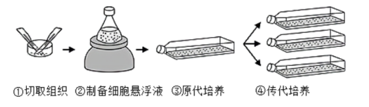 解 析:A.动物细胞培养过程需要无菌操作,故步骤①的操作需要在无菌环境中进行,A错误; B.动物细胞培养过程需要用胰蛋白酶或胶原蛋白酶处理动物组织,分散成单个细胞,制成细胞悬液,B错误; C.传代培养时需要用胰蛋白酶处理贴壁生长的细胞,使之分成单个细胞,再分瓶培养,C正确; D.步骤④为传代培养过程,该过程中部分细胞可能发生细胞转化,核型改变,D错误。 故选C。