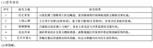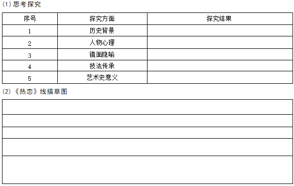 1、《阿尔诺芬尼夫妇像》(又译:“乔凡尼 · 阿诺芬尼夫妇像”或“阿诺菲尼夫妇”或“阿诺芬尼夫 妇像”)是尼德兰画家扬 ·凡 ·艾克1434年创作的一幅木板油画。该油画描绘了尼德兰典型的富 裕市民的新婚家庭,逼真地刻画了阿诺芬尼夫妇肖像。该画用色十分细腻,画中的主人翁是阿尔诺 芬尼和他的新婚妻子。阿尔诺芬尼举着右手,似在宣誓。他的妻子则虔诚地微低着头,伸出右手表 示永做丈夫的忠实伴侣。画家对环境—一进行刻画。基于历史背景、人物心理、镜面隐喻、技法传 承、艺术史,分析《阿尔诺芬尼夫妇像》,完成表格并创作《热恋》线描草图。