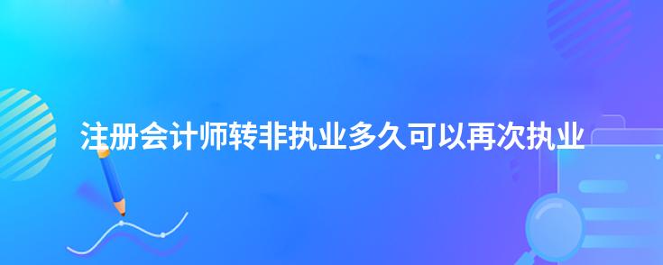 注册会计师转为非执业后,再次执业的时间不同情况可能会有所不同。一般来说,需要等待一段时间以满足相关的要求。具体的等待时间可能需要根据个人的情况和相关法规进行调整。
