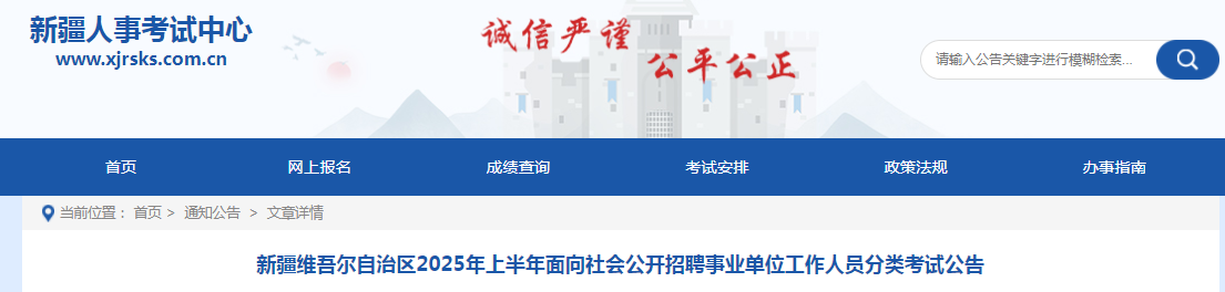本次事业单位分类考试招聘公告在自治区人力资源和社会保障厅官方网站(http://rst.xinjiang.gov.cn)、新疆人事考试中心官方网站(http://www.xjrsks.com.cn)、中国新疆人才网(http://www.xjrc365.com)发布。