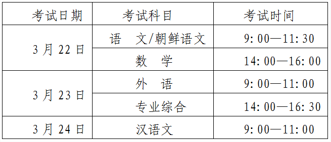 对口招生考试日期为3月22日-3月24日(具体考试时间以《准考证》公布为准),其中3月24日上午进行汉语文考试(使用朝鲜族语言文字答卷考生参加)。对口招生考试由省教育考试院统一组织实施,考试安排在市(州)标准化考点内进行。考试的组织实施、监考人员的选聘培训、试题、答题卡的安全保密按照普通高考标准执行。