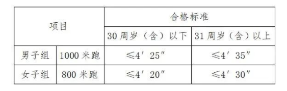 (三)体能测试:报名材料审核通过人员,将进行体能测试,体能测试项目为男性1000米跑步、女性800米跑步。体能测试标准如下: