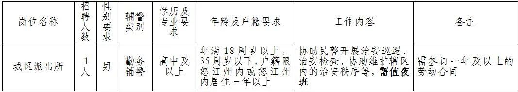 贡山县公安局因工作需要,特面向社会公开招聘1名警务辅助人员,从事警务辅助工作。警务辅助人员不具有公务员(人民警察)身份,不纳入编制管理,行使人民警察职权。