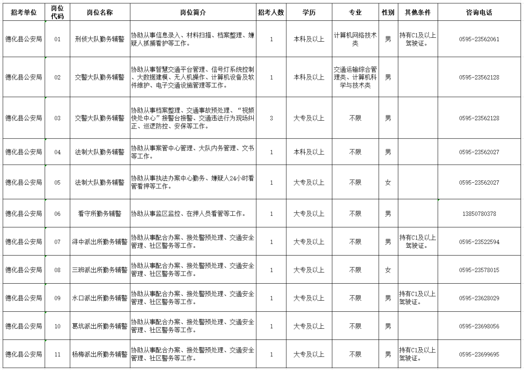 附件1德化县公安局2025年度面向社会公开招聘第二期警务辅助人员岗位表.xls