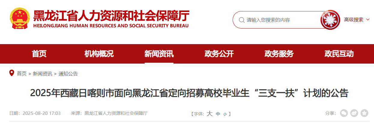 2025黑龙江三支一扶考生们的最后机会来了,西藏日喀则市面向黑龙江省定向招募高校毕业生“三支一扶”的名额有20人,报名时间为8月21日09:30至8月28日18:30.
