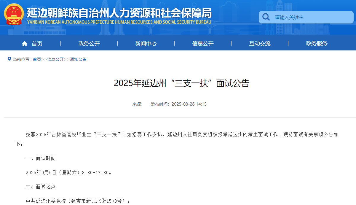 按照2025年吉林省高校毕业生“三支一扶”计划招募工作安排,延边州人社局负责组织报考延边州的考生面试工作。现将面试有关事项公告如下: