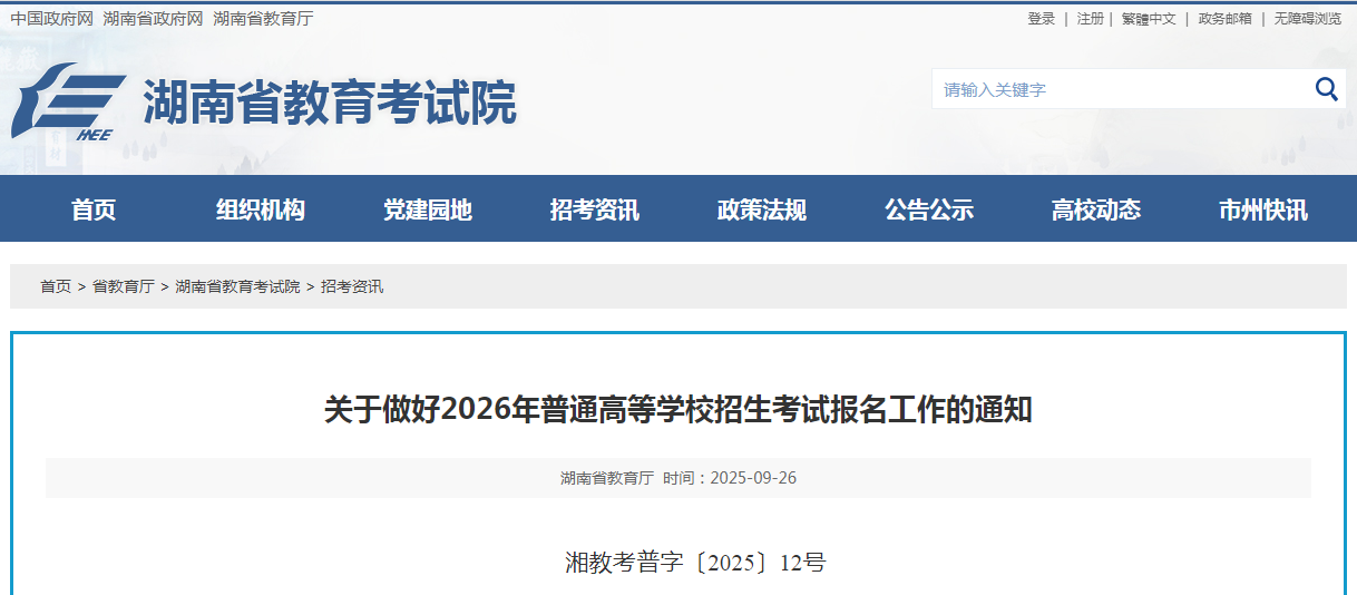 2026年湖南省普通高等学校招生考试(包括全国统考、省级统考和高校单独组织的招生考试,以下简称高考)报名工作有关事项通知