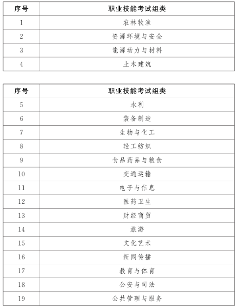 根据《职业教育专业目录》,将职业技能考试划分为19个组类,对应19个专业大类。