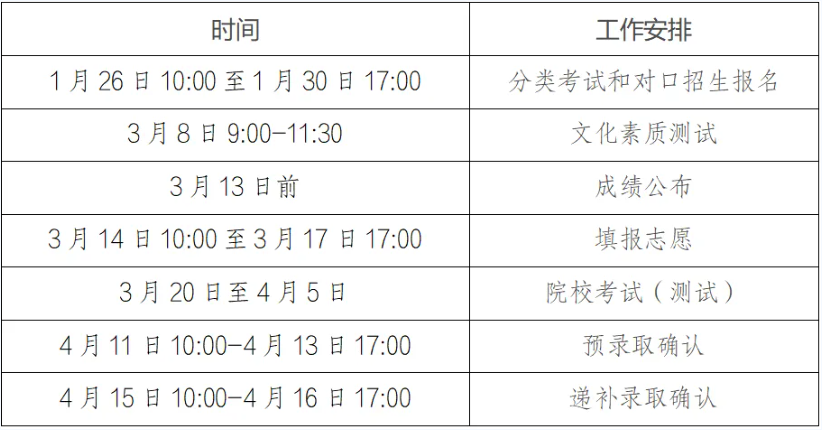 分类考试和对口招生“报名”和“志愿填报”分阶段进行,即符合报名条件的考生网上报名后,参加全省统一组织的文化素质测试,成绩公布后再填报院校与专业志愿。所有报名参加分类考试或对口招生的考生均编排文化素质测试考场,符合免文化素质测试条件的退役军人等考生,可自行决定是否参加文化素质测试。