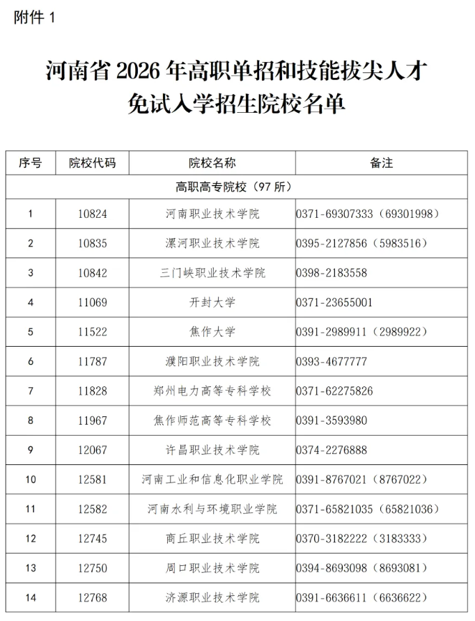河南省教育厅发布《关于做好2026年“高职单招”和技能拔尖人才免试入学工作的通知(附招生院校名单)》