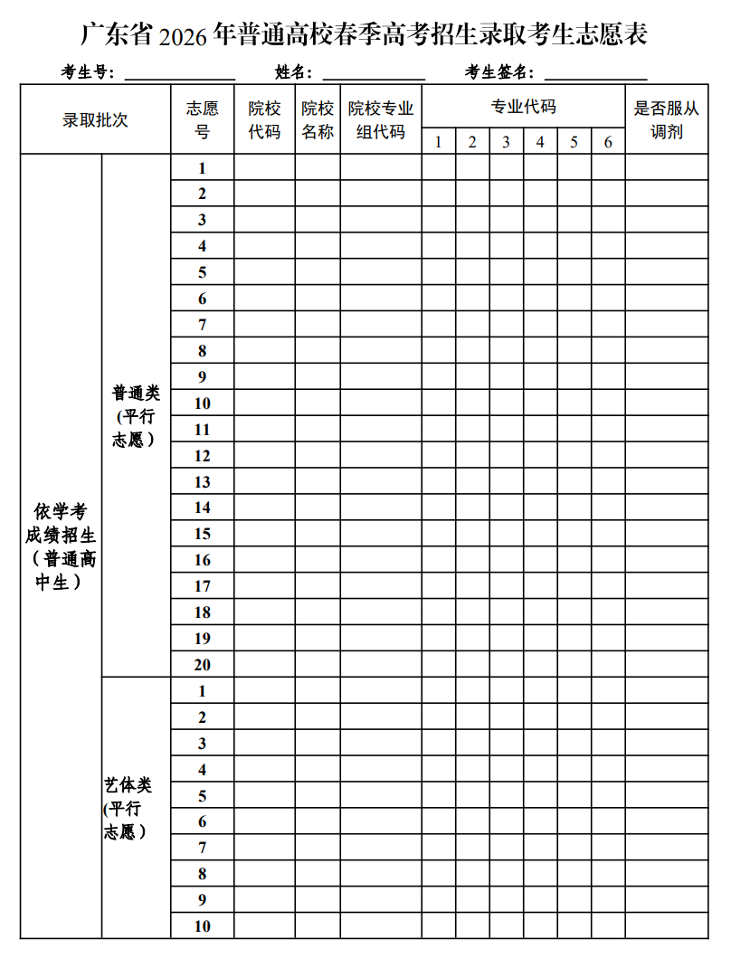 (四)拟定志愿表草稿。考生网上填报志愿前,可预先填好《广东省2026年普通高校春季高考招生录取考生志愿表》(见附件,下称“志愿表”)。考生填报志愿,应参考院校往年录取情况,“冷”“热”搭配,形成合理梯度。
