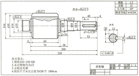 (5)由主视图(结合尺寸)可看出该零件的主要结构,是由几段不同直径的()组成,最大圆柱上制有(),最右端圆柱上有一个()。
