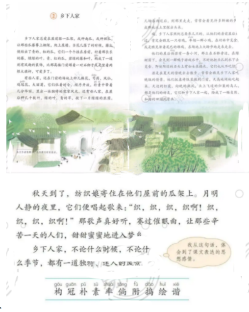 问题:(1)本文的写作特点(2)围绕四年级的同学写一个教学目标(3)围绕最后一句话作者写的就是不论什么时候,不论什么时间,乡下这个人家永远都是这么美,这么漂亮来写一个教学设计。