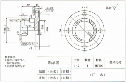(1)此零件是()类零件。主视图符合零件的()位置,采用()剖视图。