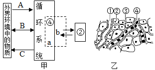 (1)葡萄糖被细胞利用需经过的内环境是图乙中所示的[ ]_________和[ ]_________。毛细淋巴管壁细胞生活的内环境是_________(填图乙中标号)。