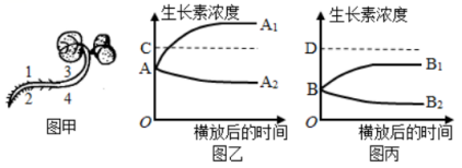 (3)图乙中A1曲线对应图甲()(填“1”、“2”、“3”或“4”)处的生长素相对浓度。测量发现,图乙中的C比图丙中的D低,原因是()。