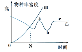 (1)甲和乙曲线中代表初生演替的是 ,判断的依据是 。 (2)乙曲线中ab段物种丰富度下降的原因可能是 。在b点通过人类的参与,使b点与c点之间的这段时间内物种数目增多,群落发生 演替。 (3)N点时两个群落的物种丰富度相等,则两群落含有的物种 (填“相同”“不相同”或“不一定相同”),原因是 。