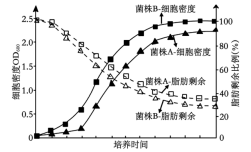 (2)在处理含油废水的同时,可获得蛋白质,实现污染物资源化。为评价A、B两菌株的相关性能,进行了培养研究,结果如下图,据图分析,应选择菌株 进行后续相关研究,理由是 。