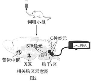 (2)为进一步探究苦味对于甜味的抑制效应及其调控机制,科学家对小鼠进行饲喂和刺激特定脑区(如图2)。检测位于脑干r区的S神经元和C神经元的膜电位变化,处理及结果见表。