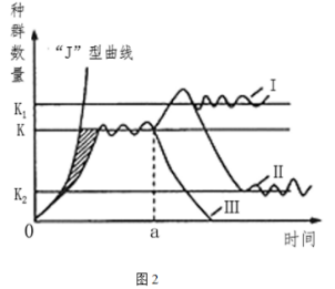 (1)①A、B图中能反映该鱼种群的数量变化的曲线是()。 ②若在t2时种群数量为N,为保持这种鱼类资源的可持续增长,应使这种鱼捕捞后的种群数量保持在()水平。 ③在t1时该种群的年龄组成为()。 Ⅱ.如图2表示某种群数量变化可能的几种情形,其中a点表示外界因素的变化,据此分析: (1)图中阴影部分表示()。 (2)若图示种群为东亚飞蝗,应控制其种群数量为()(填K或K1或K2),干旱能抑制造成蝗虫患病的一种丝状菌的生长,若a点变化为干旱,则a点后的变化曲线为()。