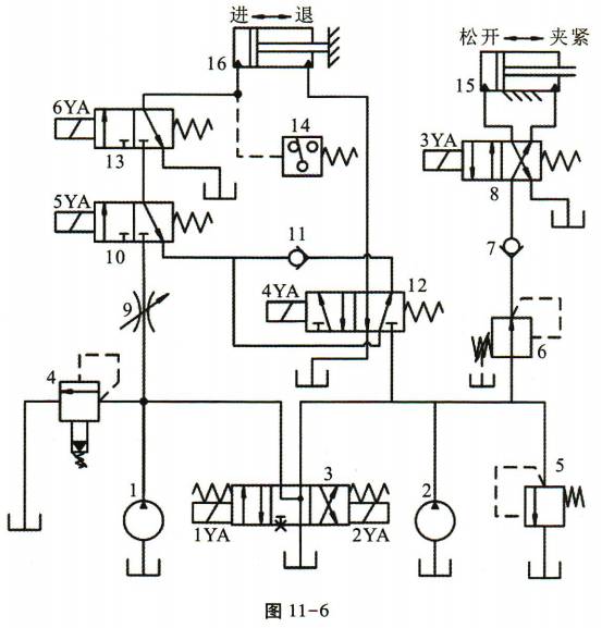 (3)对夹紧缸15起保压作用的是元件()(填序号);缸16快进、快退时,起限压保护作用的是元件()(填序号);缸16工进时,起溢流稳压作用的是元件()(填序号)。