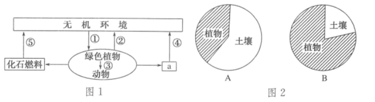 (1)图1中的a在生态系统的成分中指的是 。碳元素在生物群落中主要以 的形式存在。 (2)碳元素从非生物环境进入生物群落的途径①表示的是 过程,除此之外,还可以通过硝化细菌等生物的 过程。过程②表示 。 (3)现今全世界都倡导的“低碳生活”措施是为了减缓主要由图1中 (填数字)产生的温室效应现象。 (4)图2中表示热带雨林的是 ,原因是 。
