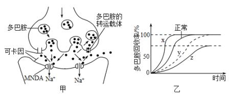 (3)由图甲可知,可卡因的作用机理是 ,导致突触间隙中多巴胺含量增多,从而增强并延长对脑的刺激,产生“快感”。这一过程可以用图乙中 (填“x”、“y”或“z”)曲线表示。