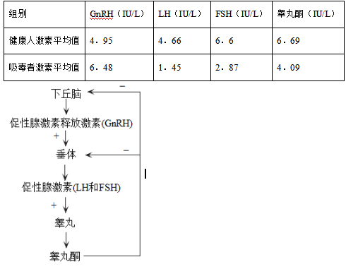 (4)戒毒所对一批吸毒者男性和健康男性的相关激素检测结果如表,其中睾酮(雄性激素)分泌调节机制如图。