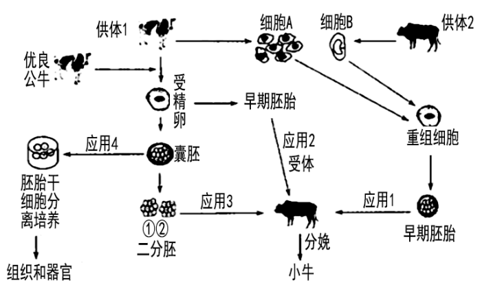 (1)应用1中获得的良种小牛,遗传物质来源于______________个体,性别为______________。