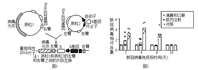 (4)为了检测疫苗的效果,科学家用不同方式给雪貂接种重组腺病毒疫苗后,感染新冠病毒,一段时间后检测新冠病毒含量,结果如图2所示,说明重组腺病毒疫苗_______________,且效果最好的免疫方式是______________。