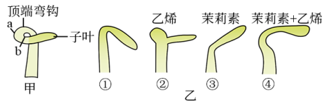 (3)由图乙可知,乙烯可_______(填“促进”或“抑制”)顶端弯钩的形成;茉莉素也是一类重要的植物激素,其与乙烯在促进弯钩形成方面表现为_______(填“协同”或“拮抗”)关系。