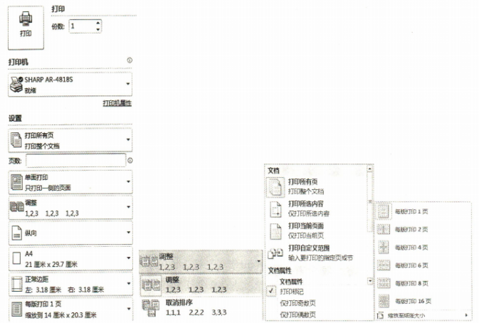 (1)单击“调整右侧”下三角按钮,选中“()”选项将完整打印一套后再打印第二套;选中“()”选项则第一页全部打印完后再打印第二页。
